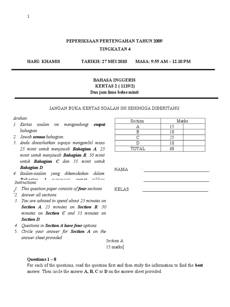 Contoh soalan spm bahasa inggeris kertas 2. Contoh kertas peperiksaan bahasa malaysia tahun 3 kertas. Ujian pertengahan tahun bahasa melayu tingkatan 1satu contoh 2.